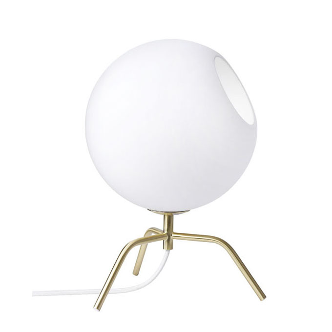 Bug, bordlampa i rolig design. Trebent underrede i mässing, rund glaskupa i opalglas. Dekorativ liten lampa som både ger mysigt ljus och är en fin inredningsdetalj. Vit kabel med brytare.